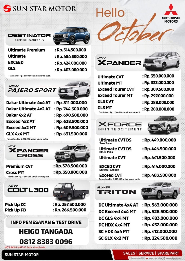 Penjualan istimewa ini hanya berlaku untuk waktu terbatas. Rasakan kenyamanan, keamanan, dan gaya berkendara dengan Mitsubishi. Hubungi Heigo Tangada di nomor 0812-8383-0096 sekarang untuk mendapatkan penawaran terbaik!